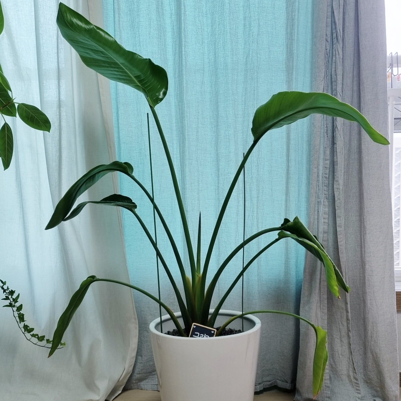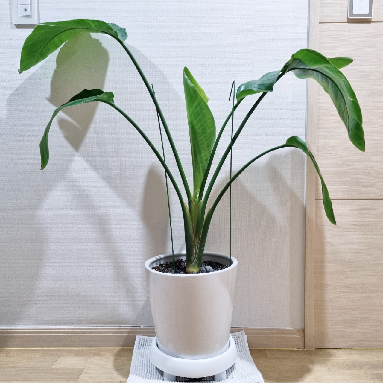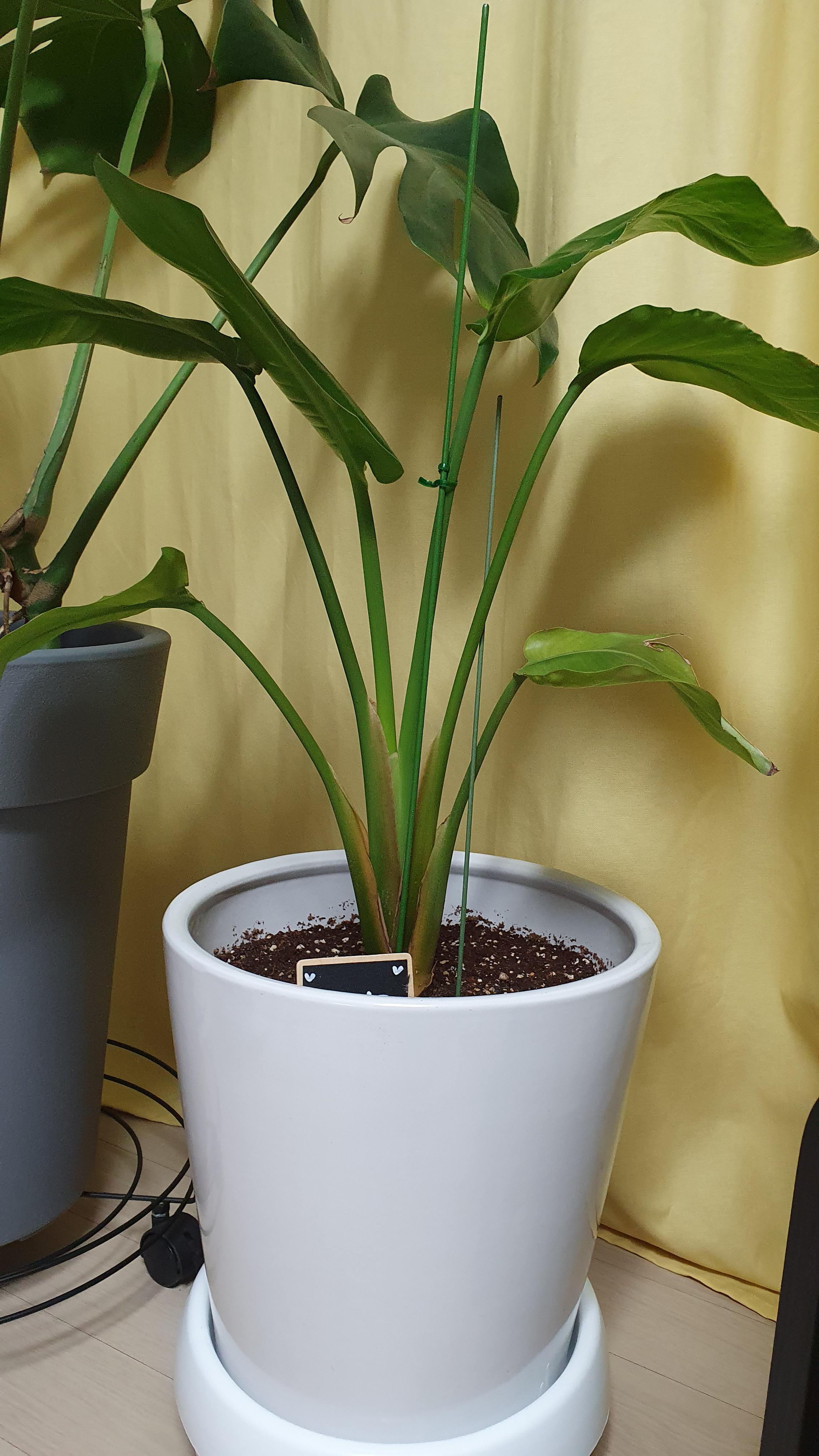 사실 19년도 여름쯤 처음 선물 받았을 때의 화분은 가로세로 20cm 정도의 작은 화분에 2포기가 오밀조밀 담겨있었고 너무 비좁아 보여서 그 해 가을에 분갈이를 2개 화분으로 포기를 나누어 해줬었어요. 아쉽게도 분갈이 전 최초의 모습은 사진이 없네요. 이 극락조는 신랑의 친구가 집들이 하던 날 선물로 들고 온 화분이었는데, 집들이 하면서 술주정을 심하게 부리고 가셔서 한동안 극락조는 저에게 찬밥이었답니다.ㅠㅠ 조금 화가 가라앉고나서 생각해보니 이 친구들이 무슨 죄가 있겠어요.... 미안한 생각이 들어 가을이 되어서야 분갈이를 해준 거랍니다. 분갈이한 화분 중 큰 화분의 사진이예요. 분갈이 하고나니 새 잎이 겨울임에도 삐죽 올라와주었답니다. 그리고는 봄이 될 때까지 마구마구 자라나 하엽은 제거해주고 또 가운데에서 새 잎을 올리는 상황이예요.