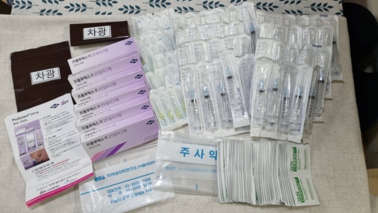 프롤루텍스, 이름에서도 조금은 유추할 수 있듯이 프로게스테론 호르몬을 투여하는 주사입니다. 이 주사에는 프로게스테론 25mg이 들어있구요, 시험관 시술을 준비하시는 분들에게 처방이 되는 주사약제입니다. 이 프로게스테론은 배아가 자궁 내막에 착상하기 좋도록 자궁내막의 변화를 주고 안정화시키는 역할을 하는 호르몬인데요, 임신 초기에 이 프로게스테론의 혈중 농도가 안정적으로 유지되지 않으면 임신 유지가 어렵게 되고, 질 내 출혈을 발생시킬 수도 있습니다. 특히 저처럼 시험관 아기를 준비하시는 분들이라면 황체의 프로게스테론 분비가 원활하지 않기 때문에 임신 9~10주 정도까지는 인위적으로 프로게스테론을 보충해주어야 착상 및 임신이 유지될 수 있다고 합니다. 저 역시도 담당교수님 말씀으로는 임신되면 9주차까지는 주사 맞아야 한다고 하셨어요. 일단은 이식 전 1주일치와 이식 후 2주치 해서 총 3주치를 처방 받아왔습니다.