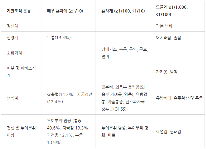 프롤루텍스의 부작용은 투여부위 반응이 아주 큰 부분을 차지하고 있습니다. 통증이 무려 49.6%, 자극감 13.3%, 가려움 12.1%, 부종 10.9%네요. 그리고 두통과 질출혈, 자궁경련도 매우 흔하게 나타난다고 합니다. 저는 투여부위 반응 중 통증만 느껴지는 상태이구요, 그 외 부작용 중 2~3가지 정도가 일시적으로 나타났다 없어졌다 하고 있습니다.